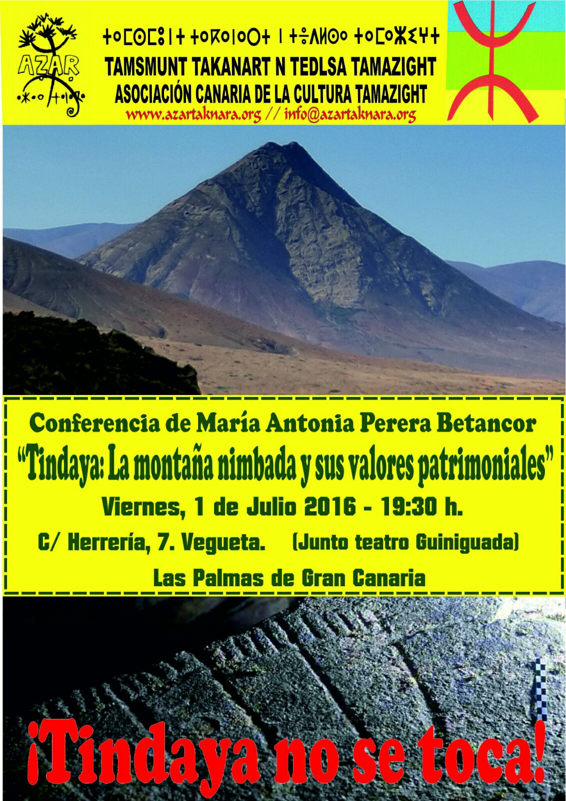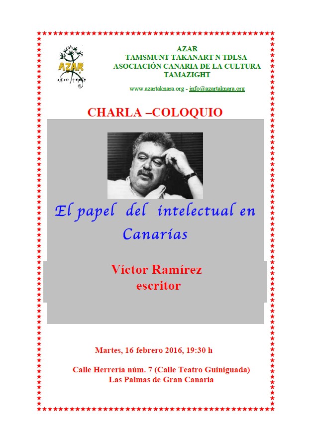 2016 El papel del intelectual en Canarias, Víctor Ramírez, 16 de febrero 2016La Montaña de Tindaya, Jose Farrujia, 22 de abril 2016Tindaya La montaña nimbada sus valores patrimoniales, María Antonia (Nona) Perera 01 julio 2016La Kabilia y la actualidad en la Tamazgha – Masin Ferkal, 11 de agosto 2016 Volver a conferencias