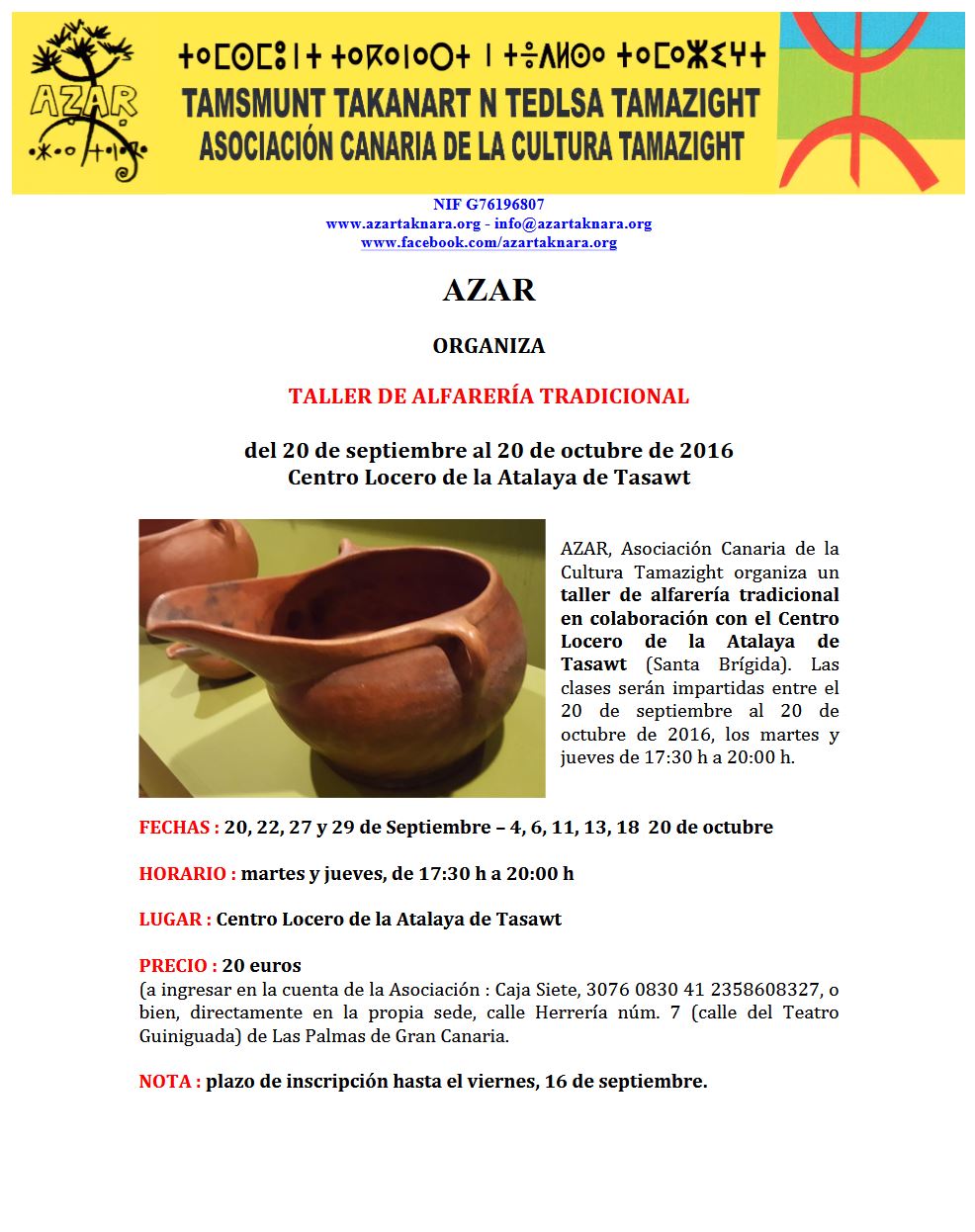 2016 Curso de Lengua Tamazight – 14 de abril 2016I Taller de Alfarería – 20 de septiembre 2016Curso de Lengua Tamazight 2 – 21 de octubre 2016 volver a talleres y cursos